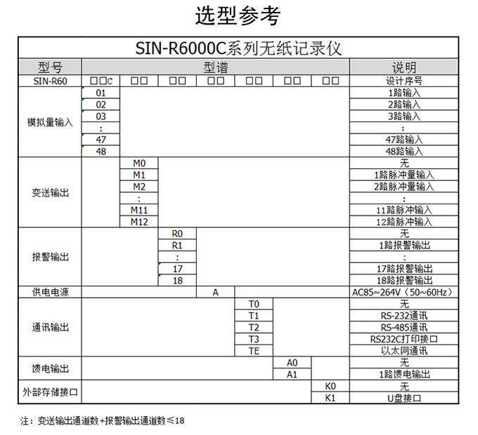 SIN-R6000C系列彩色無紙記錄儀48路(萬能輸入(可組態(tài)選擇輸入:標準電壓、標準電流、熱電偶、熱電阻、頻率、毫伏等)??蓭?8路報警輸出,12個變送輸出,RS232/485通訊接口,以太網(wǎng)接口,微型打印機接口和USB接口,SD卡插座;可提供傳感器配電;具有強大的顯示功能,實時曲線顯示,歷史曲線追憶,棒圖顯示,報警列表顯示。人性化的外觀設計、良好的功能體現(xiàn)、可靠的硬件品質(zhì)、精湛的制造工藝,使SIN-R6000C具有更高的性能價格比。