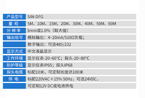 應用行業(yè) SIN-DFG分體式超聲波液位計廣泛用于罐體、水池、水庫的液位和體積測量,也可用于明渠的流量測量。