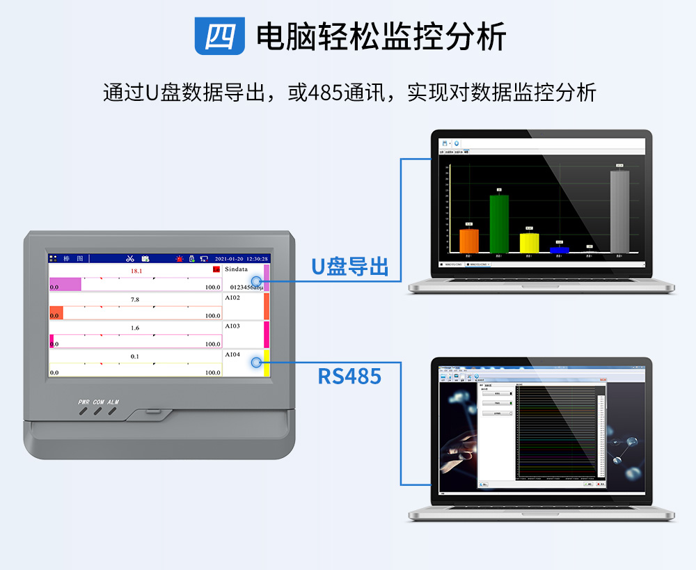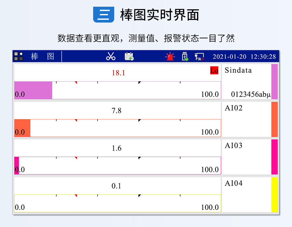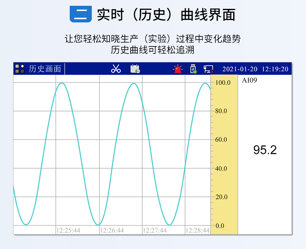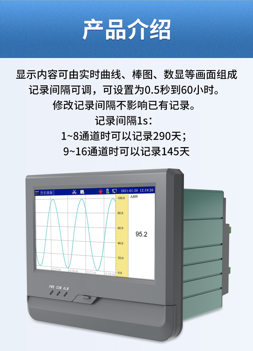 觸摸式彩色無紙記錄儀具有 60 個運算函數、24 路模擬量輸入、3 路 開關量輸入、3 路脈沖量輸入、6 路模擬量變送輸出、16 路開關量輸出, 可實現運算、顯示、記錄、報警、分析統計報表、高速采樣等功能,通 過 RS-232/RS-485 和以太網通訊接口,可實現遠程實時監(jiān)控、組態(tài)管理、 歷史數據讀取等功能,通過 U 盤可實現組態(tài)管理、監(jiān)控畫面管理和歷史 數據管理等功能。