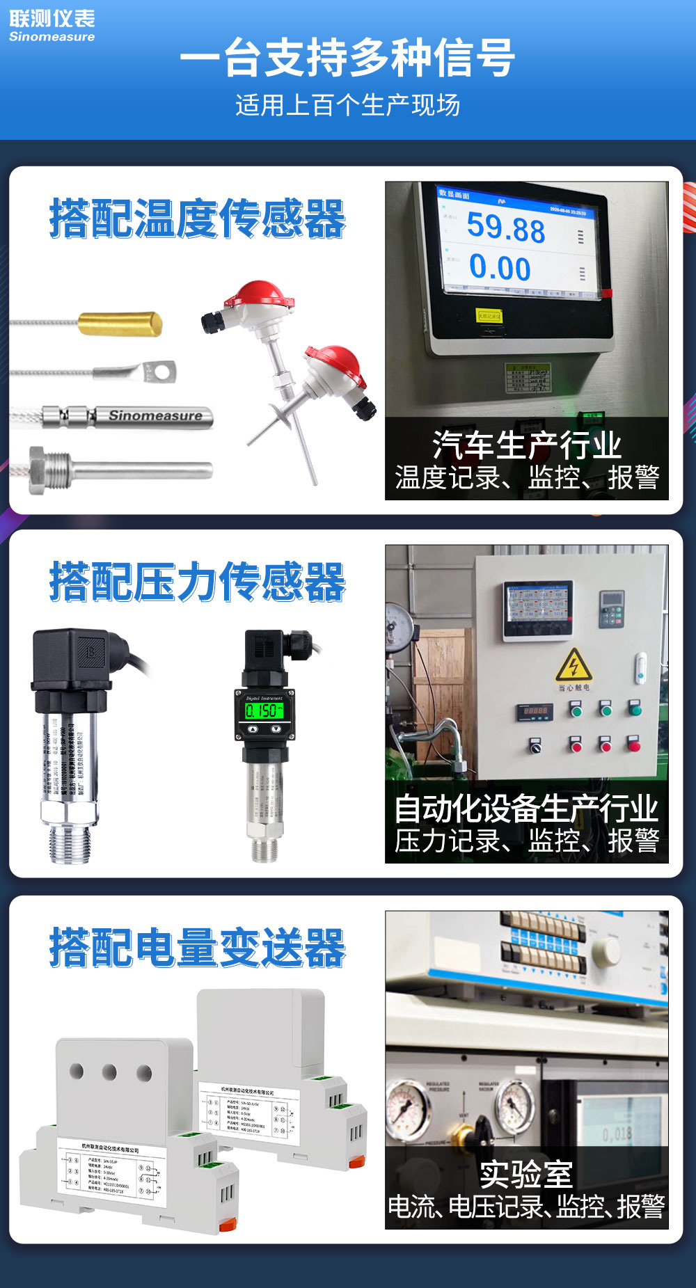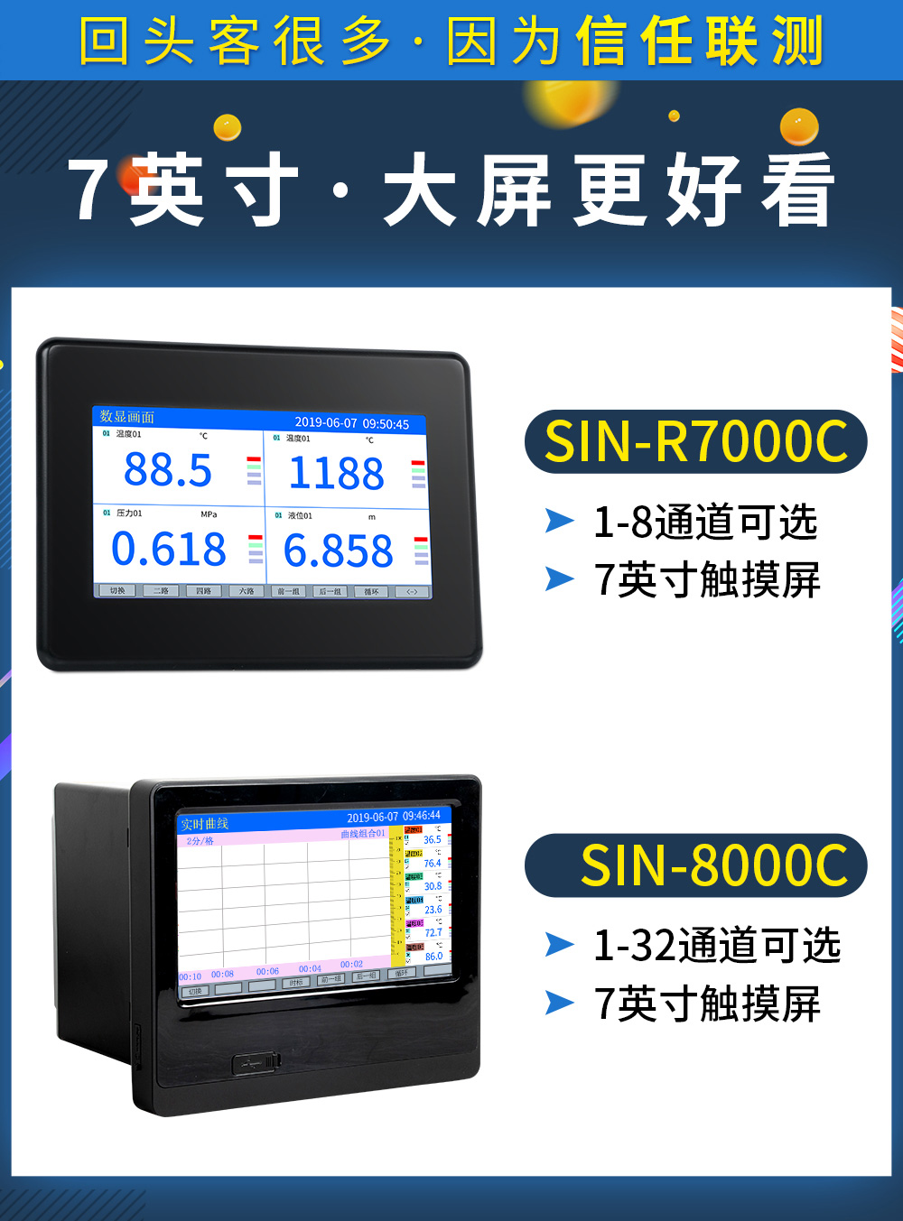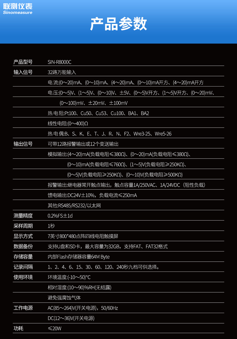 聯(lián)測儀表SIN-R8000C可帶12路報警輸出或12個變送輸出,RS232/485通訊接口,以太網(wǎng)接口,微型打印機(jī)接口和USB接口,SD卡插座;可提供傳感器配電;采用拔插式間距為5.08的接線端子,方便電氣連接;具有強(qiáng)大的顯示功能,實(shí)時曲線顯示,歷史曲線追憶,棒圖顯示等。人性化的外觀設(shè)計、完美的功能體現(xiàn)、可靠的硬件品質(zhì)、精湛的制造工藝,使本產(chǎn)品具有更高的性能價格比。