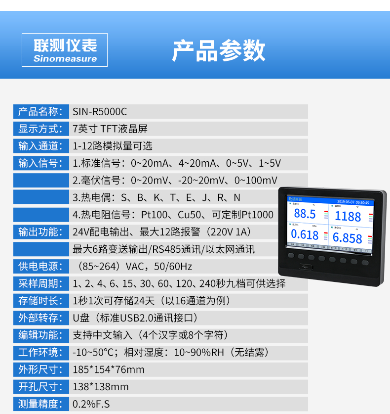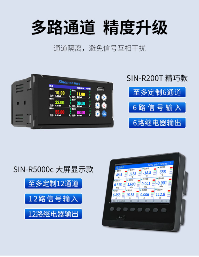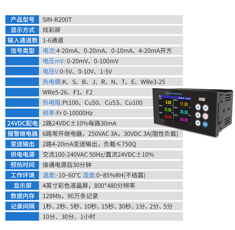 聯(lián)測(cè)儀表SIN-R200T工業(yè)無(wú)紙記錄儀,6通道萬(wàn)能輸入,160*80 面板尺寸??奢斎腚娏鳌㈦妷?、熱電偶、熱電阻和頻率等工業(yè)信號(hào),以數(shù)值、棒和曲線形式實(shí)時(shí)顯示數(shù)據(jù),定時(shí)將數(shù)據(jù)存儲(chǔ)于儀表內(nèi)部電子存儲(chǔ)器,可通過(guò) USB 設(shè)備快速轉(zhuǎn)存歷史數(shù)據(jù)。